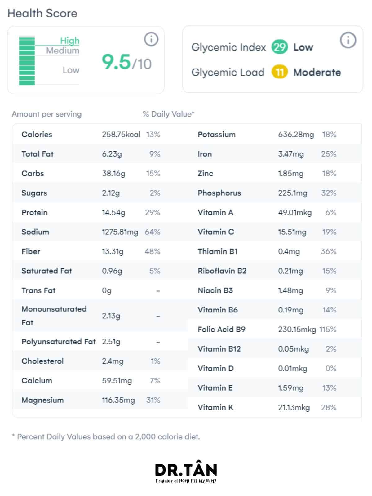 Nếu bạn cần thông tin dinh dưỡng cụ thể do tình trạng sức khỏe, vui lòng tham khảo ý kiến của bác sĩ của bạn. Thông tin dinh dưỡng được cung cấp trong thực đơn này đã được chúng tôi biên tập một cách cẩn thận nhất, tuy nhiên, chúng tôi không thể đảm bảo tính chính xác của các giá trị một cách tuyệt đối. Vui lòng xem thêm tuyên bố từ chối trách nhiệm của chúng tôi.