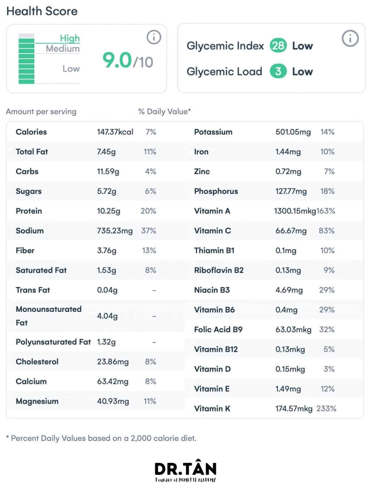 Nếu bạn cần thông tin dinh dưỡng cụ thể do tình trạng sức khỏe, vui lòng tham khảo ý kiến của bác sĩ của bạn. Thông tin dinh dưỡng được cung cấp trong thực đơn này đã được chúng tôi biên tập một cách cẩn thận nhất, tuy nhiên, chúng tôi không thể đảm bảo tính chính xác của các giá trị một cách tuyệt đối. Vui lòng xem thêm tuyên bố từ chối trách nhiệm của chúng tôi.